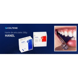 HANEL Articulating Paper 200 µ - hartie articulatie pentru prima etapa de testare, pentru diferentierea zonelor de masticatie ridicata si scazutaAvantaje:Contactele mai puternice sunt colorate pe o zonaMaterial de testare grosCulori disponibile: red (rosu), blue (albastru)Dimensiuni: 18 x 50mmPrezentare:Hartie articulatie 200µ - 1 x 300 bucati..